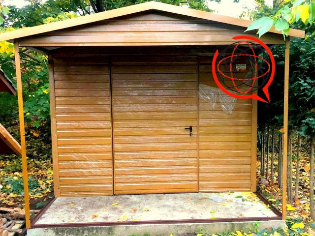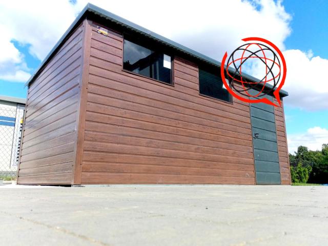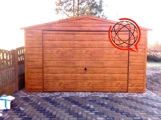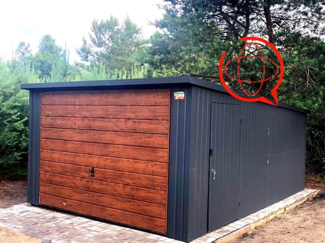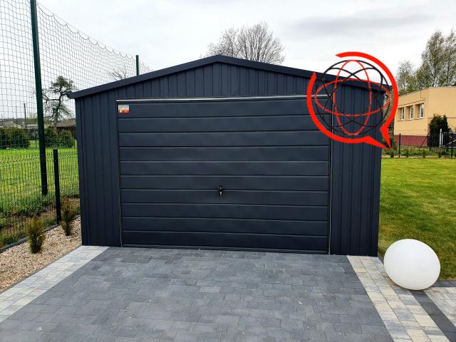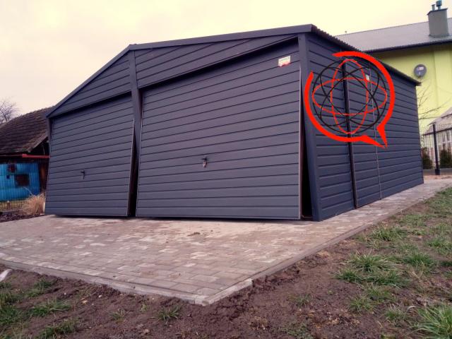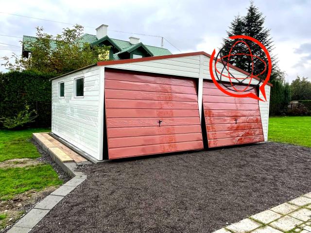 Konstrukcja garażu jest pomalowana farbą podkładową. Niektóre elementy konstrukcji w kolorze brązowym mogą być widoczne na zewnątrz garażu.