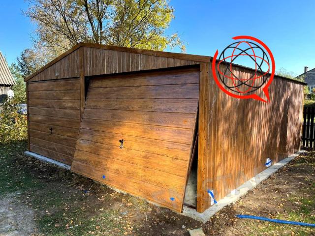 Konstrukcja garażu jest pomalowana farbą podkładową w kolorze brązowym.