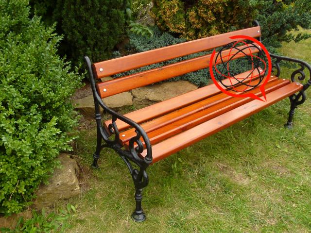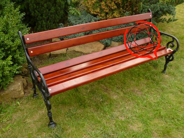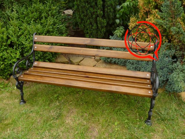 Solidna i wygodna ławka , składa się z 6 desek świerkowych zabezpieczonych impregnatem lub lakierobejcą odlew żeliwny w kolorze czarnym. Produkt jest meblem ogrodowym wolnostojącym. Deski pomalowano lakierem wodorozcieńczalnym, zewnętrznym przeznaczonym do dekoracyjnego i ochronnego malowania powierzchni drewnianych i drewnopochodnych narażonych na wpływ zewnętrznych warunków atmosferycznych, dającym widoczną strukturę drewna. . Elementy żeliwne są zabezpieczone antykorozyjnie podkładem , a następnie malowane farbą proszkową na kolor czarny. Waga żeliwa wynosi ok. 12,5 kg.