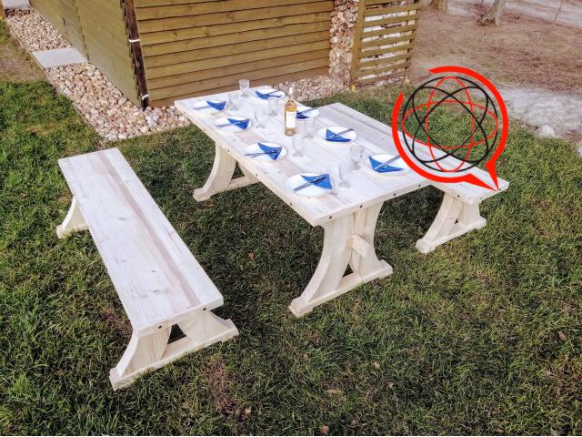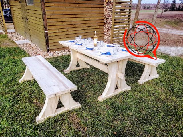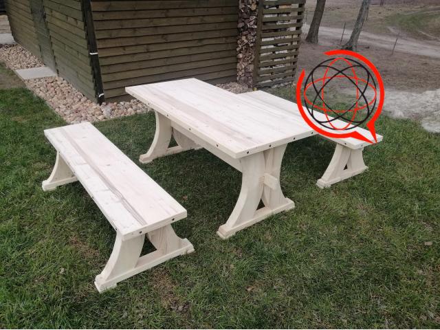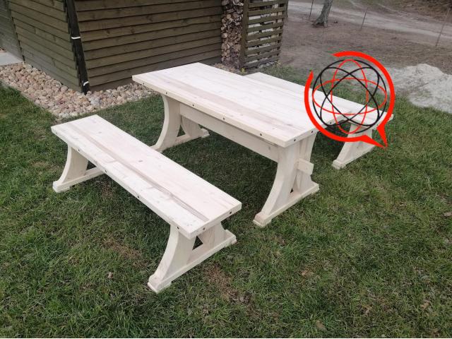 Blat stołu klejony gr 5cm, ławka również 5 cm .Elementy malowane Drewnochronem lakierobejca 2w1 przeznaczoną do dekoracyjno – ochronnego malowania przedmiotów drewnianych i na zewnątrz oraz wewnątrz pomieszczeń. Powłoka chroniona jest przed grzybami pleśniowymi i glonami.