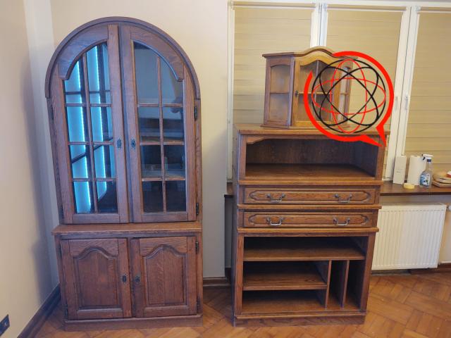 Meble używane w dobrym stanie. Można je ustawić w dowolnym zestawie, ponieważ stanowią pasujące do siebie klocki. Na zdjęciu inny odcień elementów, ale to tylko kwestia oświetlenia. Dąb rustykalny . Drewno. Mała witrynka może być sprzedana osobno 100 zl