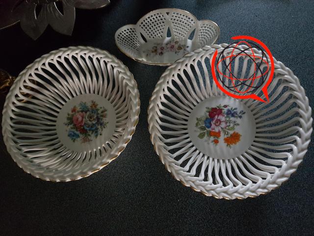 + Owalne naczyńko porcelanowe ażurowe, tej samej firmy Cluj Napoka, Rumunia. Motyw kwiatowy na dnie, delikatnie złocony rancik. 13 cm x 8 cm, wysokość 3,5 cm, 50zł.