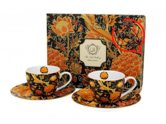 Dwie filiżanki espresso 110 ml ze spodkami CRAY FLORAL by William Morris wchodzące w skład serii Art Gallery, wykonane z porcelany New Bone China, charakteryzującej się elegancką i naturalną kremowo - białą barwą z delikatnym połyskiem a także wyjątkową wytrzymałością przy zachowaniu lekkości i delikatności.