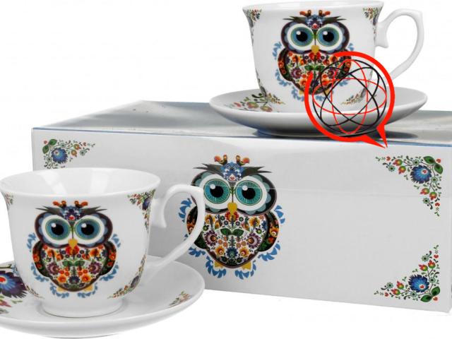 Komplet dwóch filiżanek 250 ml ze spodkami SOWA ETNO wchodzący w skład serii Sowa, wykonany z porcelany New Bone China, charakteryzującej się elegancką i naturalną kremowo - białą barwą z delikatnym połyskiem, a także wyjątkową wytrzymałością.