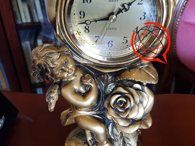 Zegar artystyczny z dominującą figurą uśmiechniętego aniołka. U podstawy zegara także krzew różany w kolorze złota.