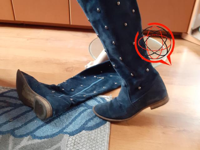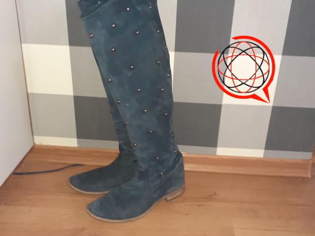 Zamszowe kozaki nr 4 Kozaki wykonane z zamszu, zapinane z boku na zamek. Niski obcas. Butki do kolan. rozm - 37 kolor - granatowy, srebrny