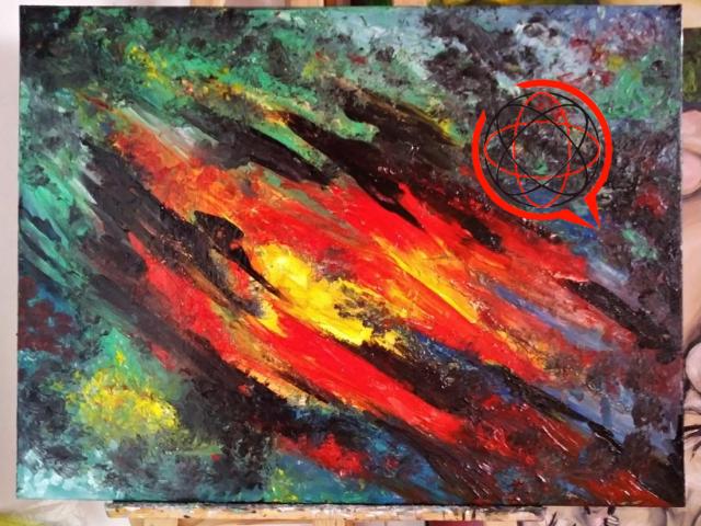 Kompozycja Abstrakcyjna- obraz olejny na płótnie o wymiarach 80cm x 60cm.Namalowany prze zemnie w Czerwcu 2018 Obraz jest abstrakcyjny, niefiguratywny w stylu Action painting. Farba została nałożona grubymi warstwami, tworząc fakturę i relief. Niektóre plamy są nakładane na siebie, tworząc nowe odcienie i kontrasty. Nie ma tu śladów rysunku ani szkicu. Obraz jest efektem spontanicznego i intuicyjnego działania.