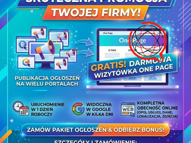 Szukasz skutecznej promocji swojej firmy w internecie? Zamów pakiet publikacji ogłoszeń na wielu portalach - a w ramach bonusu otrzymasz profesjonalną wizytówkę internetową One Page zupełnie za darmo!